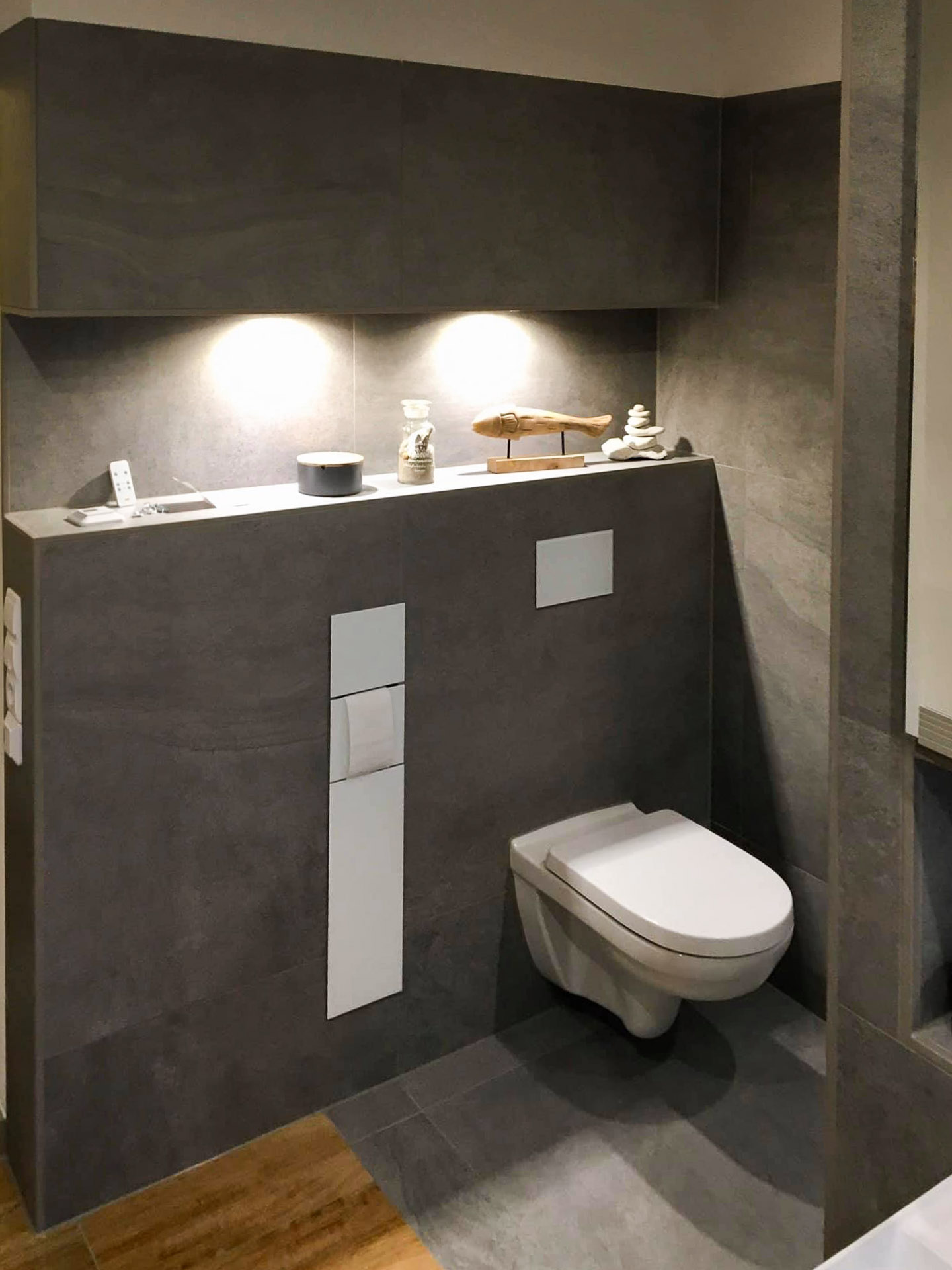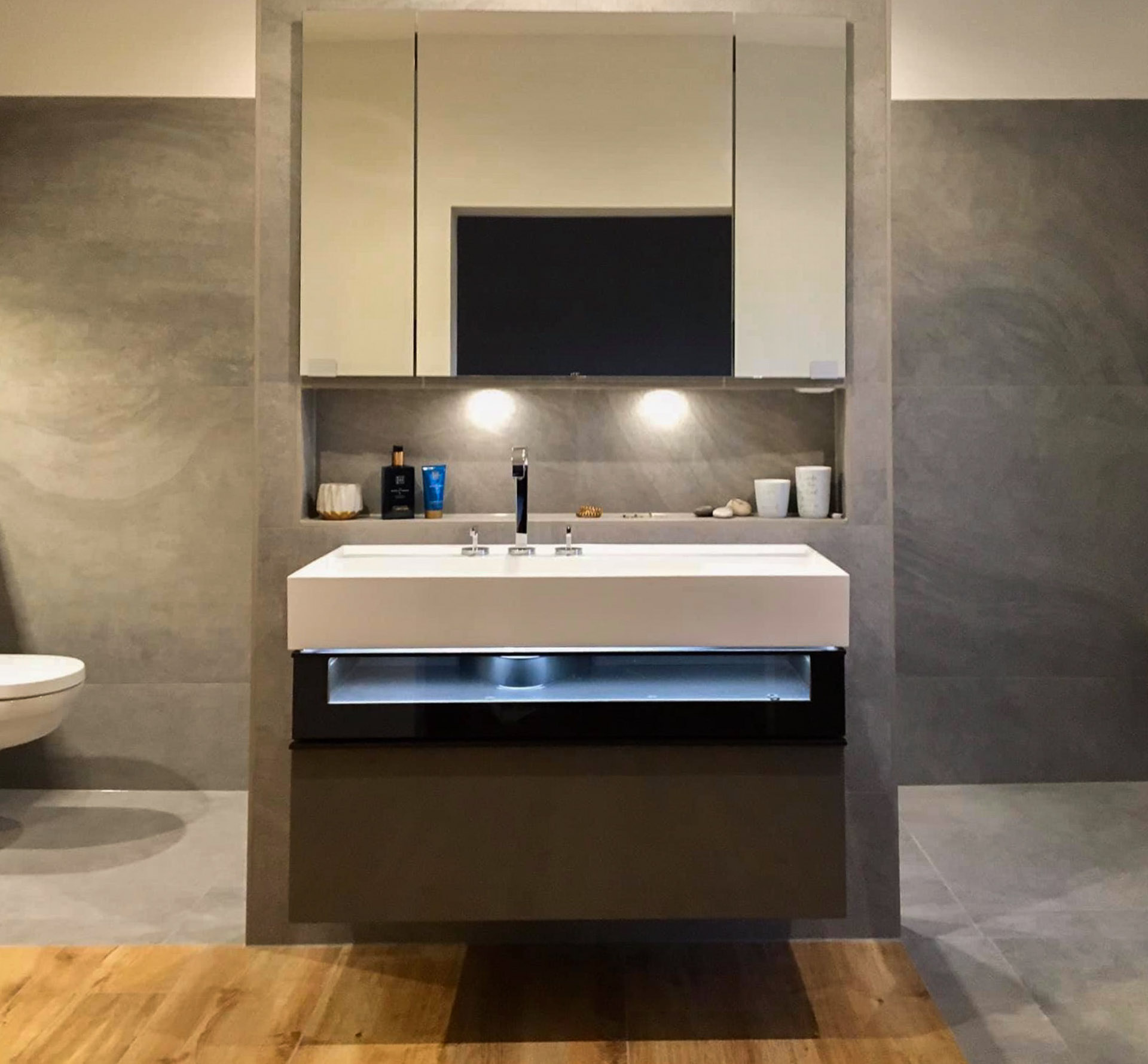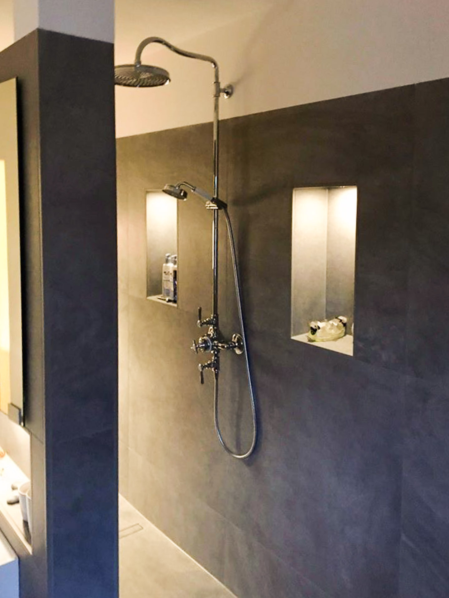 Ein Bad mit Waschtisch im Raum und dahinter liegender Dusche.